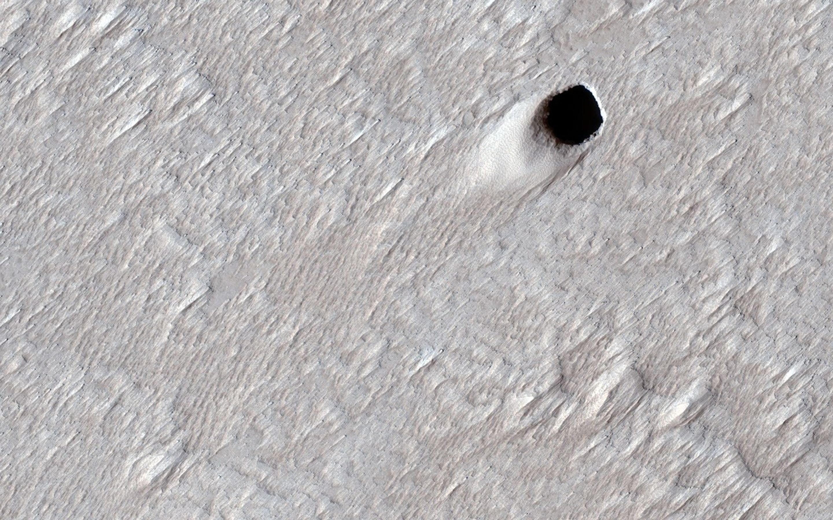 In this image, the ceiling of the lava tube collapsed in one spot and made this pit crater. The pit is about 50 meters (150 feet) across, so it's likely that the underground tube is also at least this big (much bigger than similar caves on the Earth). HiRISE can't see inside these steep pits because it's always late afternoon when we pass overhead and the inside is shadowed at that time of day.