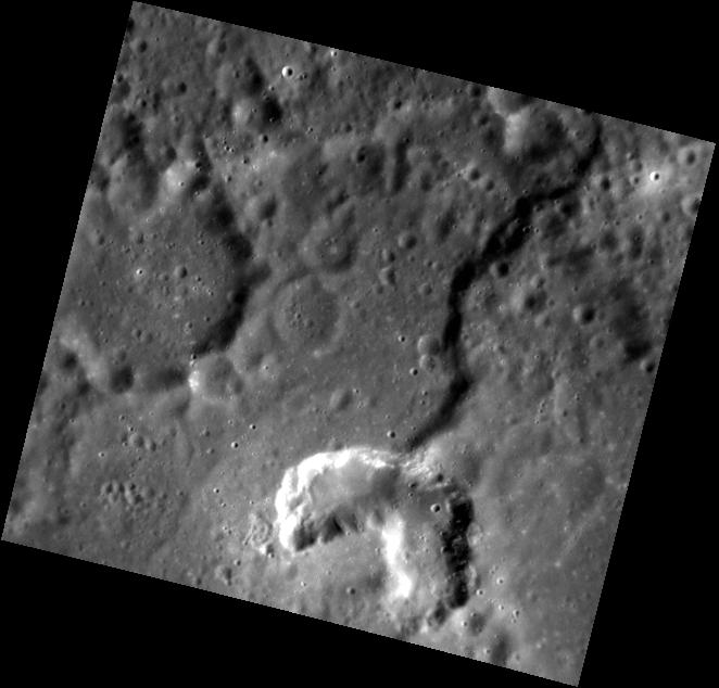 This image shows a rimless, irregular depression that appears brighter than the surrounding material. Such features are thought to be volcanic vents. The shadowed, curved feature leading into the vent is a fault scarp, also called rupes. This image was taken using the Narrow Angle Camera (NAC).
