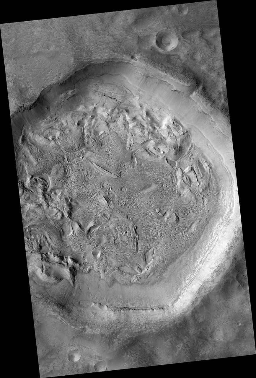 The floor of this crater appears filled with such deposits, as evidenced by surface textures such as pits, hollows, grooves, and other small filled craters. The material has undergone viscous flow, resulting in many curved ridges. Much of the original ice may have been lost to sublimation, but it is likely that a significant amount of ice remains.