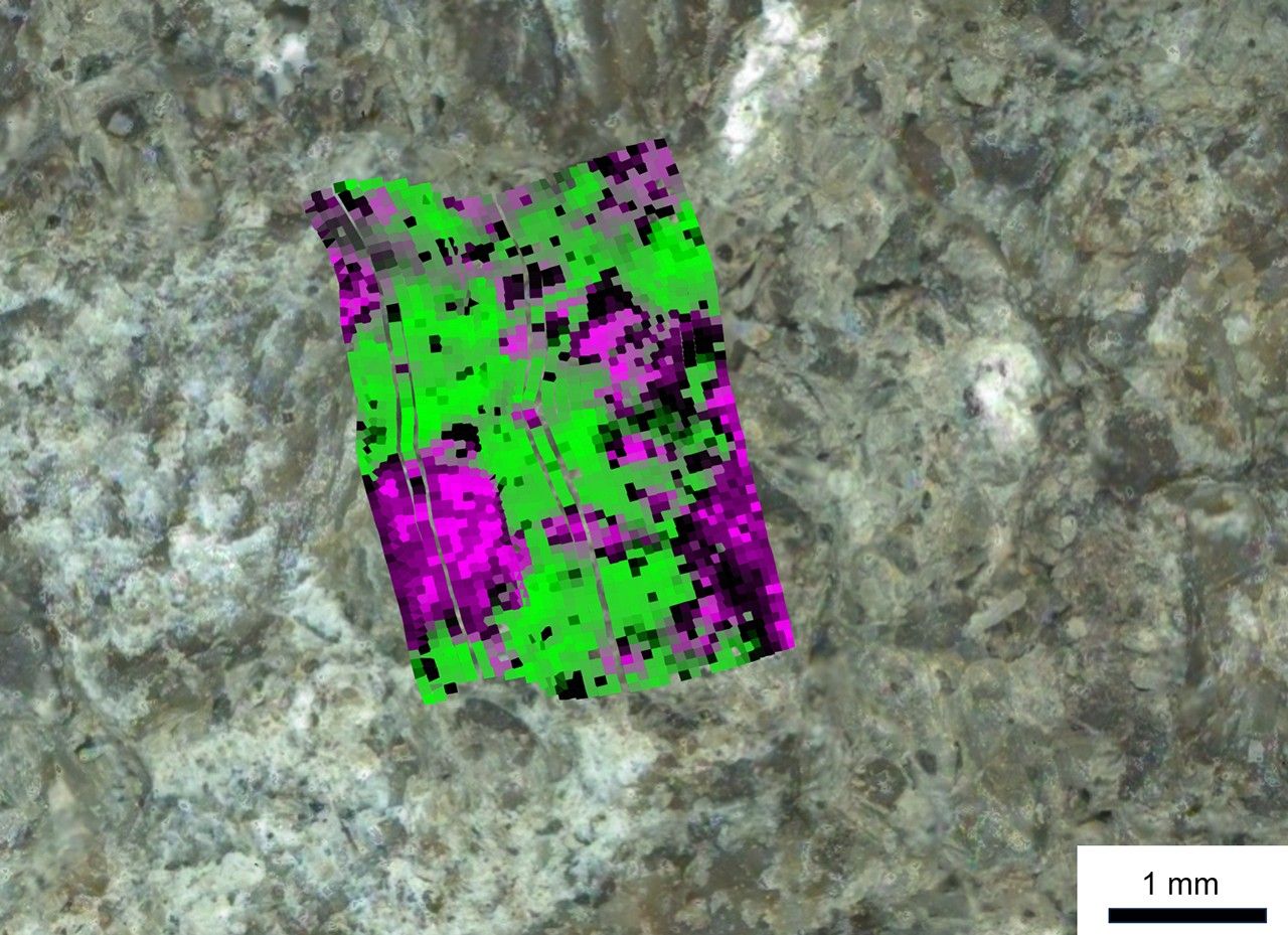 Figure B is the image of Bills Bay overlaid with PIXL chemical data showing the rock is rich in carbonates and silica, both of which are ideal for recording paleoenvironmental information and preserving signs of ancient life. The purple-colored areas are sand grains made of iron-rich carbonate. The green-colored areas between the sand grains are silica, which acts like cement, holding the sand together as a rock.