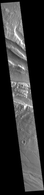 This VIS image shows part of Acheron Fossae. Acheron Fossae is the highly fractured, faulted and deformed terrain located 1,050 kilometers (650 miles) north of the large shield volcano Olympus Mons. Lava flows from Olympus Mons at the base of Acheron Fossae show that the fossae predate the flows. The scarps visible in this image are approximately one kilometer (3,300 feet) high.