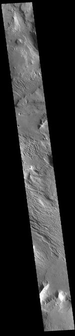This complexly eroded region is part of Aeolis Planum. The image has portions that appear to be layered material that has been eroded by wind action.