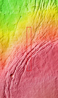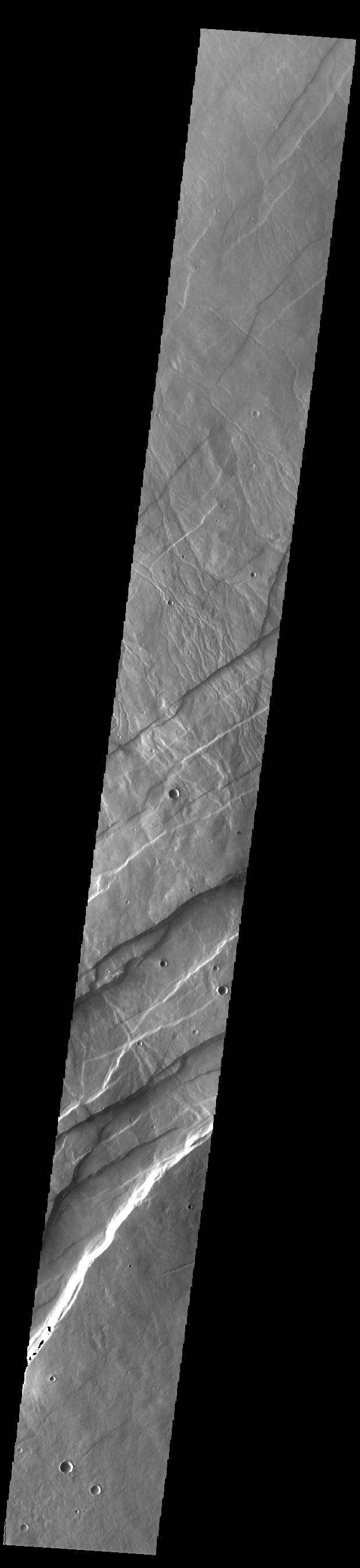 Alba Fossae is a set of long valleys on the western side of Alba Mons. These valleys are referred to as graben and are formed by extension of the crust and faulting. When large amounts of pressure or tension are applied to rocks on timescales that are fast enough that the rock cannot respond by deforming, the rock breaks along faults. In the case of a graben, two parallel faults are formed by extension of the crust and the rock in between the faults drops downward into the space created by the extension. Numerous sets of graben are visible in this THEMIS image, trending from north-northeast to south-southwest. Because the faults defining the graben are formed perpendicular to the direction of the applied stress, we know that extensional forces were pulling the crust apart in the west-northwest/east-southeast direction. The large number of graben around Alba Mons is generally believed to be the result of extensional forces associated with the uplift of Alba Mons.