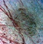This feature on Europa was seen as a dark, diffuse circular patch on a previous Galileo global image of Europa's leading hemisphere on April 3, 1997. The "bulls-eye" pattern appears to be a 140- kilometer (86-mile) wide impact scar (about the size of the island of Hawaii) which formed as the surface fractured minutes after a mountain-sized asteroid or comet slammed into the satellite. This approximately 214-kilometer (132-mile) wide picture is the product of three images which have been processed in false color to enhance shapes and compositions.