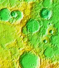Dark slope streaks mark this crater rim. This crater is located within the much larger Tikhonravov Crater in Arabia Terra.