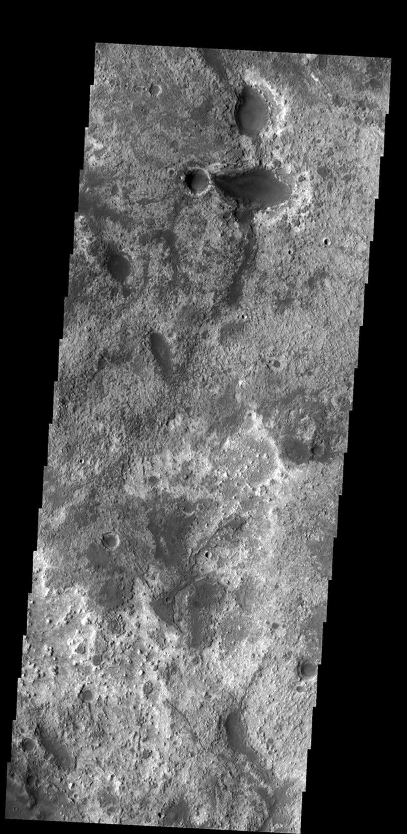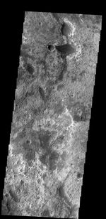 Note: this THEMIS visual image has not been radiometrically nor geometrically calibrated for this preliminary release. An empirical correction has been performed to remove instrumental effects. A linear shift has been applied in the cross-track and down-track direction to approximate spacecraft and planetary motion. Fully calibrated and geometrically projected images will be released through the Planetary Data System in accordance with Project policies at a later time.