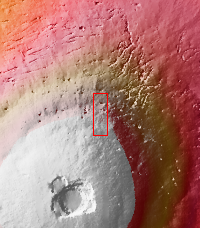 The pits in this VIS image are collapse features on the northern flank of Ascraeus Mons. Such collapse pits, often forming a linear pattern, are thought to be related to lava tubes below the surface that have been emptied of the final flow and forming a void. When the weight of the roof over the void overcomes the strength of the walls gravity caused the roof to collapse.
