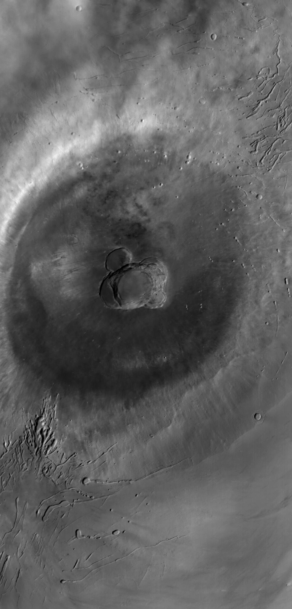 This red wide angle Mars Global Surveyor (MGS) Mars Orbiter Camera (MOC) image shows Ascraeus Mons, the northernmost of the three Tharsis Montes shield volcanoes. Ascraeus Mons is about 460 km (~286 mi) across and its summit is at an elevation of about 18 km (11 mi) above the martian datum -- the elevation designated as 0 km. The center of the summit caldera is near 11°N, 104°W. Sunlight illuminates the scene from the left/upper left.