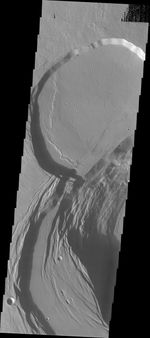 Note: this THEMIS visual image has not been radiometrically nor geometrically calibrated for this preliminary release. An empirical correction has been performed to remove instrumental effects. A linear shift has been applied in the cross-track and down-track direction to approximate spacecraft and planetary motion. Fully calibrated and geometrically projected images will be released through the Planetary Data System in accordance with Project policies at a later time.