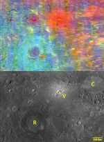 The top image is a MASCS VIRS interpolated color composite of the craters Rachmaninoff (lower left) and Copland (upper right). The bottom image is a monochrome MDIS mosaic of the same area. In the VIRS image, red areas like Copland (C) are brighter than blue areas like Rachmaninoff (R). The very bright red region in-between is a suspected volcanic vent (V). The color differences revealed in the VIRS image reveal differences in the composition of the surface rocks, as well as varying degrees of exposure to space weathering in the harsh environment of Mercury.