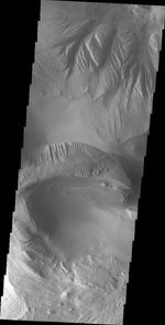 Note: this THEMIS visual image has not been radiometrically nor geometrically calibrated for this preliminary release. An empirical correction has been performed to remove instrumental effects. A linear shift has been applied in the cross-track and down-track direction to approximate spacecraft and planetary motion. Fully calibrated and geometrically projected images will be released through the Planetary Data System in accordance with Project policies at a later time.
