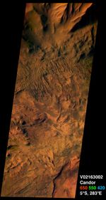 This image from the camera system on NASA.s Mars Odyssey was acquired of Candor Chasma within Valles Marineris, centered near 5 degrees south latitude, 283 degrees west longitude. This visible color image shows the effects of erosion on a sequence of dramatically layered rocks. These layers were initially deposited within Candor Chasma and have subsequently been eroded by a variety of processes, including wind and down-slope motion due to gravity. Relatively dark materials appear to mantle some areas of the layered deposits; these dark materials are likely sand. Few impact craters of any size can be seen in this image, indicating that the erosion and transport of material is occurring at a relatively rapid rate, so that any craters that form are rapidly buried or eroded. This image was acquired using the thermal infrared imaging system.s visible bands 1 (centered at 420nanometers), 2 (centered at 550 nanometers), and 3 (centered at 650nanometers), and covers an area approximately 19 kilometers (12 miles) in width by 50 kilometers (50 miles) in length.