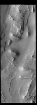 Cavi Angusti is located near the south polar cap and consists of large irregular steep-sided depressions termed cavi. This VIS image is located in the center of the region. Both layering and gullies are visible in the center of the image.
