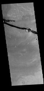 Today's VIS image shows a section of Cerberus Fossae. Located southeast of the Elysium Planitia volcanic complex, the linear graben near the top of the image was created by tectonic forces related to the volcanic activity. The graben are sources of both channels and significant volcanic flows. Cerberus Fossae cuts across features such as hills, indicating the relative youth of the tectonic activity. Graben form where extensional tectonic forces allows blocks of material to subside between paired faults.