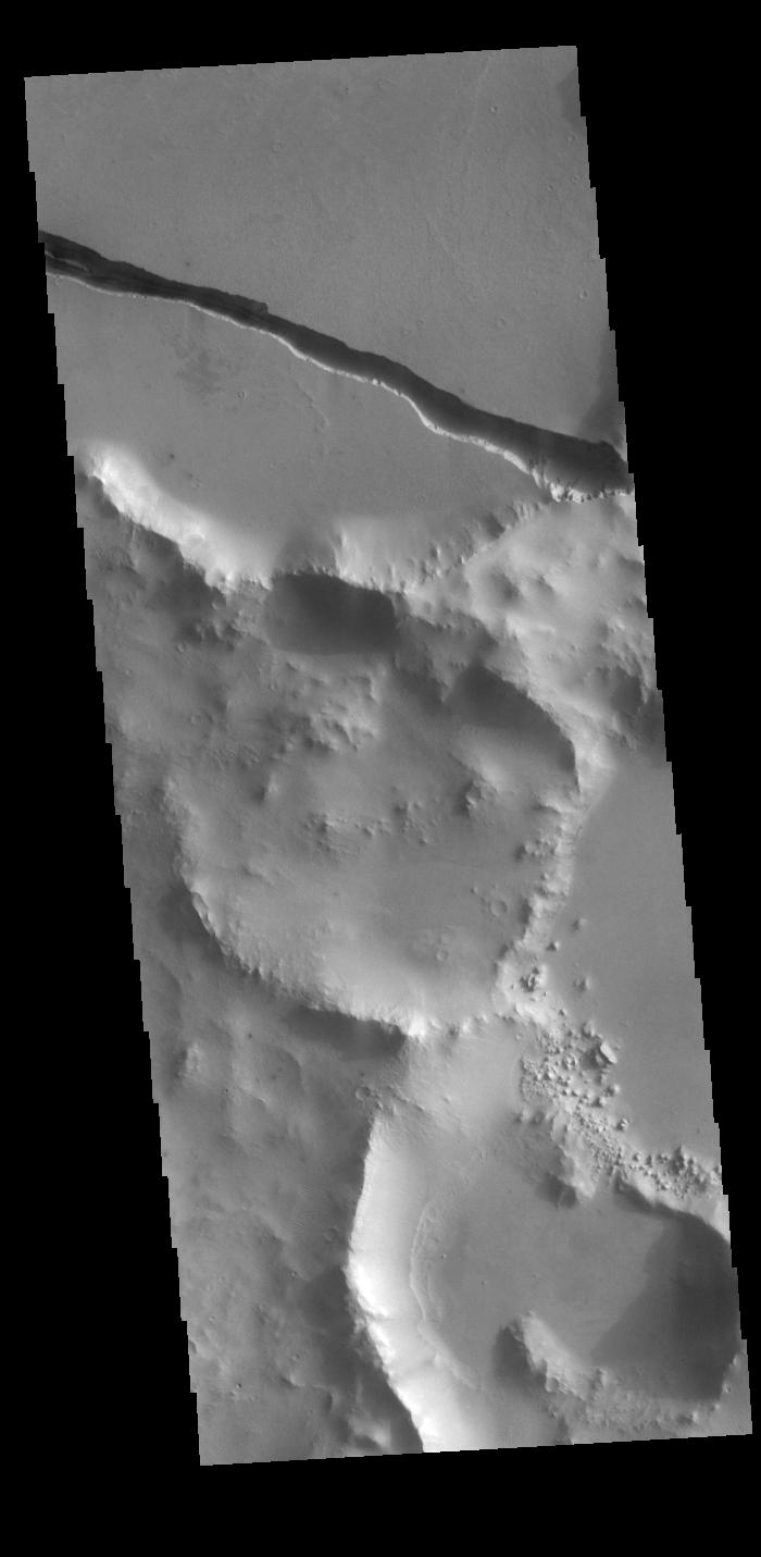Today's VIS image shows a section of Cerberus Fossae. Cerberus Fossae are located in Elysium Planitia, southeast of the Elysium Mons volcanic complex. The linear feature in the image is a tectonic graben. Graben are formed by extension of the crust and faulting. When large amounts of pressure or tension are applied to rocks on timescales that are fast enough that the rock cannot respond by deforming, the rock breaks along faults. In the case of a graben, two parallel faults are formed by extension of the crust and the rock in between the faults drops downward into the space created by the extension. This graben and others in the region, trend from north-northwest to south-southeast. Because the faults defining the graben are formed perpendicular to the direction of the applied stress, we know that extensional forces were pulling the crust apart in the east-northeast/west-southwest direction. The Cerberus Fossae graben are sources of both channels and significant volcanic flows. Cerberus Fossae cuts across features such as hills, indicating the relative youth of the tectonic activity. The Cerberus Fossae graben are 1235km long (767 miles).