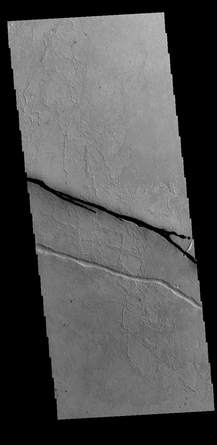 Today's VIS image shows a section of Cerberus Fossae. Cerberus Fossae are located in Elysium Planitia, southeast of the Elysium Mons volcanic complex. The linear features in the image are tectonic graben. Graben are formed by extension of the crust and faulting. When large amounts of pressure or tension are applied to rocks on timescales that are fast enough that the rock cannot respond by deforming, the rock breaks along faults. In the case of a graben, two parallel faults are formed by extension of the crust and the rock in between the faults drops downward into the space created by the extension. Two graben are visible in this THEMIS image, trending from west-northwest to east-southeast. Because the faults defining the graben are formed perpendicular to the direction of the applied stress, we know that extensional forces were pulling the crust apart in the north-northeast/south-southwest direction. The Cerberus Fossae graben are sources of both channels and significant volcanic flows. The rough surface around the graben is thought to be volcanic flows. Cerberus Fossae cuts across features such as hills, indicating the relative youth of the tectonic activity.