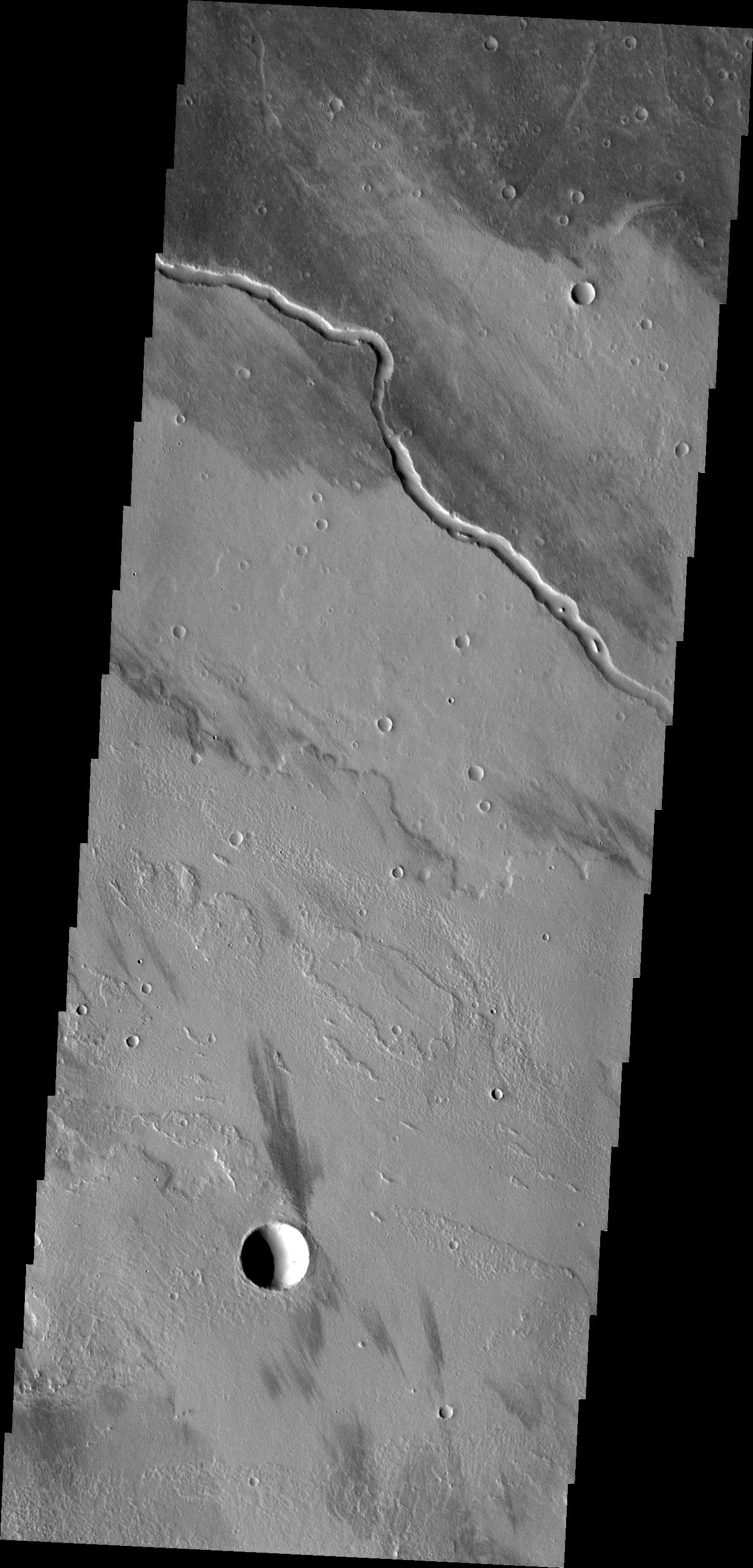 This channel is located within the Tharsis volcanic flows. It was most likely carved by the flow of molten lava.