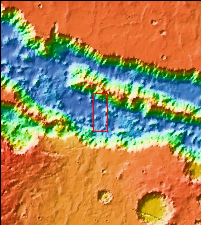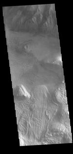 This VIS image is located on the eastern side of Coprates Chasma, near Capri Chasma. The image shows a large lobe shaped landslide deposit at the bottom of the canyon cliff face. Sand dunes are visible both on the landslide deposit and other parts of the canyon floor. Coprates Chasma is one of the numerous canyons that make up Valles Marineris. The chasma stretches for 960 km (600 miles) from Melas Chasma to the west and Capri Chasma to the east. Landslide deposits, layered materials and sand dunes cover a large portion of the chasma floor.