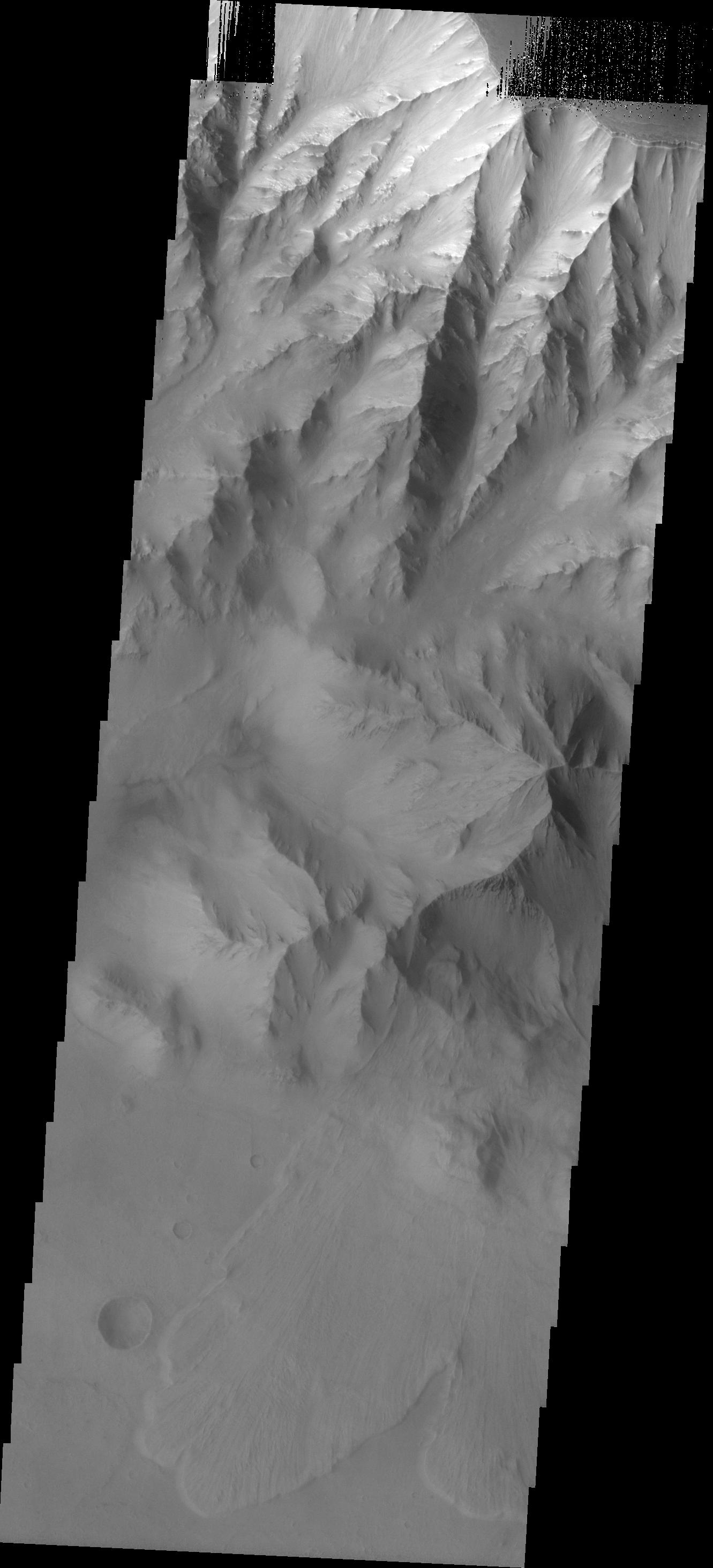 Note: this THEMIS visual image has not been radiometrically nor geometrically calibrated for this preliminary release. An empirical correction has been performed to remove instrumental effects. A linear shift has been applied in the cross-track and down-track direction to approximate spacecraft and planetary motion. Fully calibrated and geometrically projected images will be released through the Planetary Data System in accordance with Project policies at a later time.
