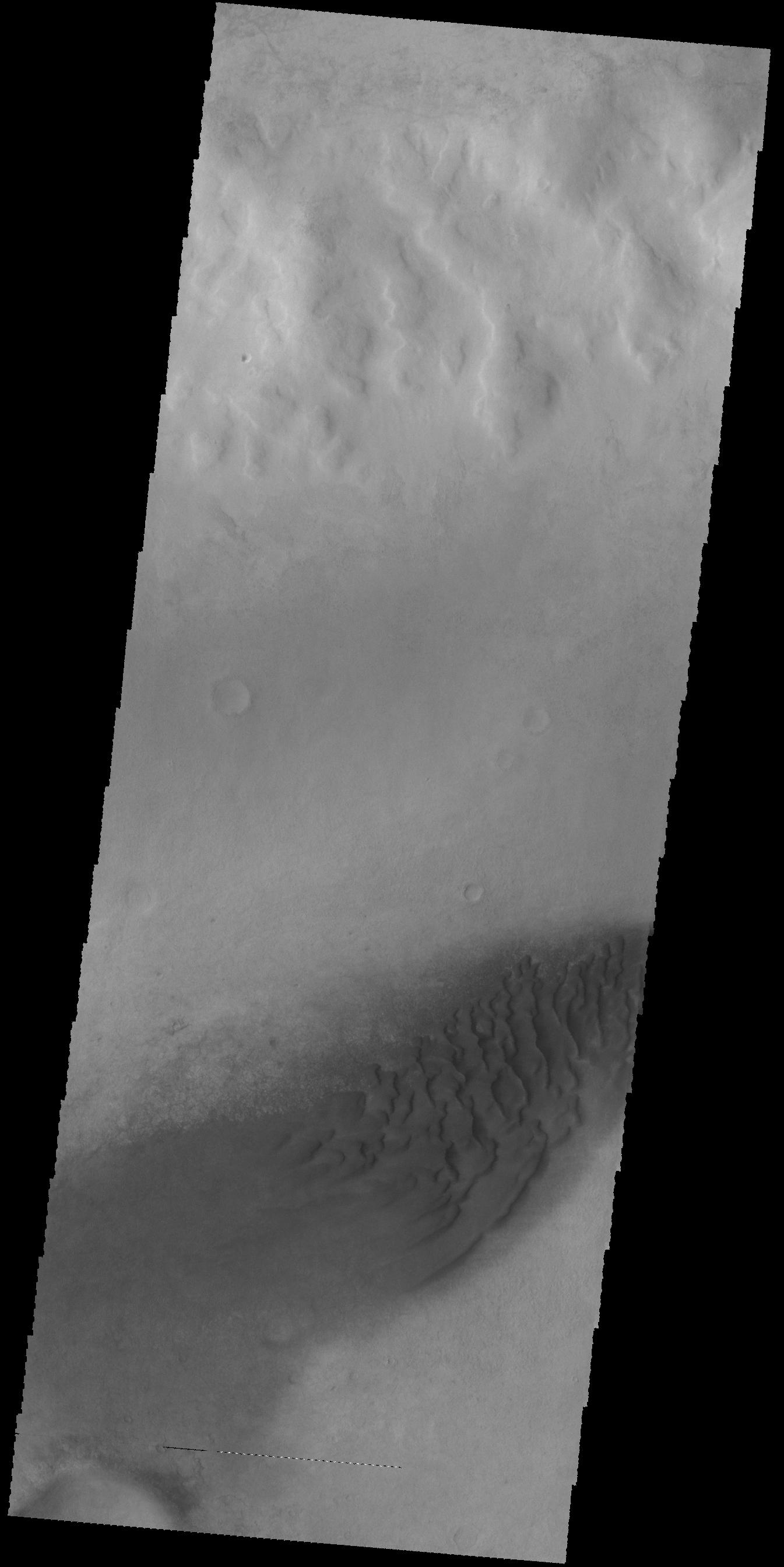 Today's VIS image shows part of the floor of an unnamed crater in Noachis Terra. The floor contains a sand sheet with dune forms.