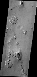 The craters in this image are located in a region of prolonged wind action. The ejecta of the craters is more resistant to the wind than the materials around it, leaving the ejecta as a "platform" around each crater.