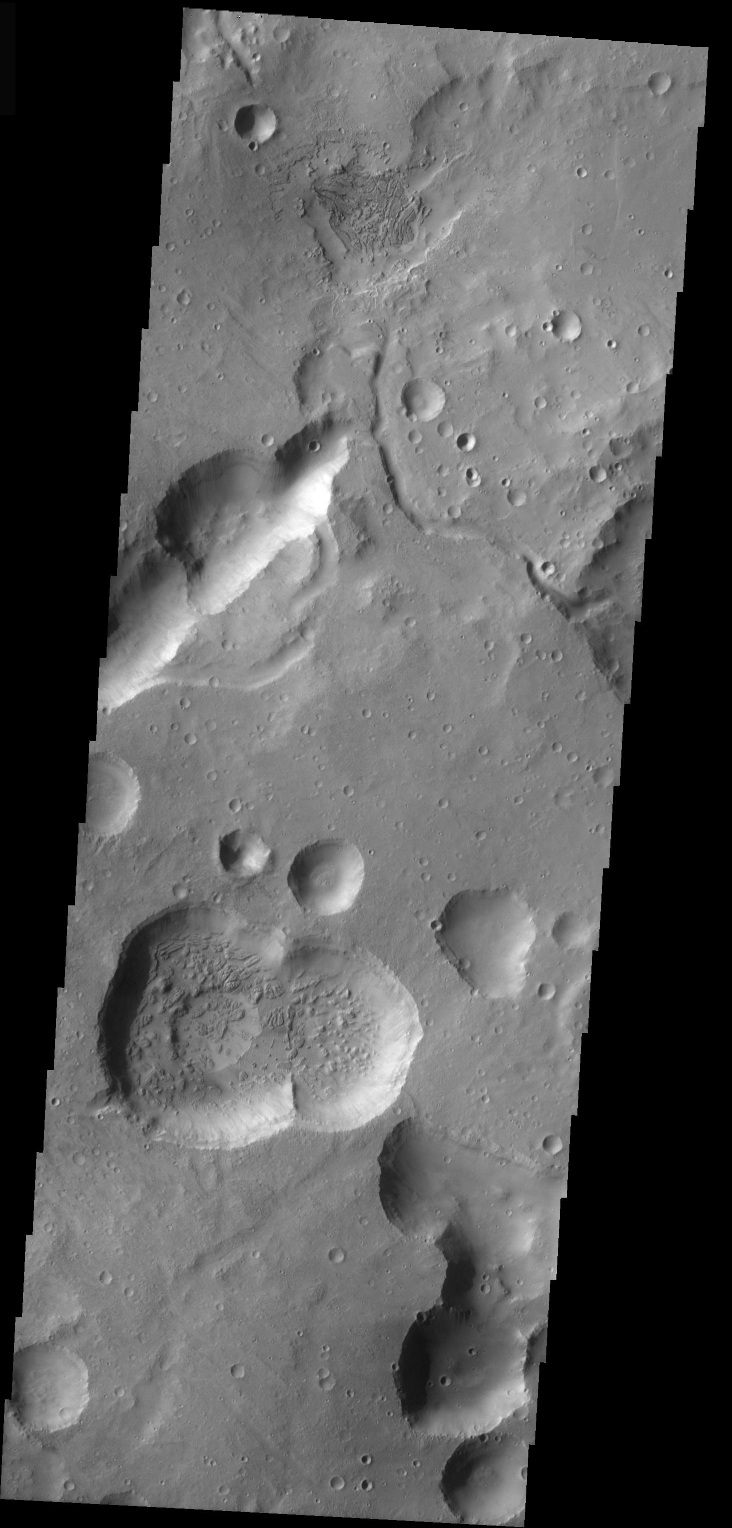This VIS image is from the Cydonia region of Mars. It illustrates how difficult it can be to identify modified impact craters in a region of collapse pits/craters. Generally collapse craters/pits have no rims and, due to structural control, form lines. Collapse pits/craters also may coalesce into scalloped-edged trenches. In this image, only the small rimmed features are likely to have formed due to impact.