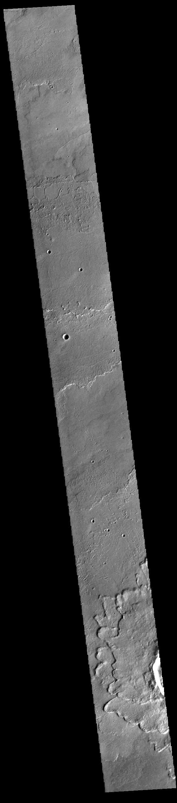 Today's VIS image shows a small portion of the immense lava flows that originated from Arsia Mons. Arsia Mons is the southernmost of the three large aligned volcanoes in the Tharsis region. Arsia Mons' last eruption was 10s of million years ago. The different surface textures are created by differences in the lava viscosity and cooling rates. The lobate margins of each flow can be traced back to the start of each flow — or to the point where they are covered by younger flows. Flows in Daedalia Planum can be as long as 180 km (111 miles). For comparison the longest Hawaiian lava flow is only 51 km (˜31 miles) long. The total area of Daedalia Planum is 2.9 million square km – more than four times the size of Texas.