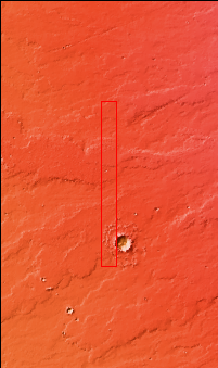 A rampart crater is located at the bottom of the image. Rampart craters are characterized by overlapping lobes with a raised edge at the margin of each part of the ejecta. Scientists believe this type of flow characterization forms when an impacting object readily melts ice in the subsurface. The presence of liquid water in the ejected material allows it to flow along the surface giving a fluidized appearance.
