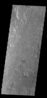 Today's VIS image shows a small portion of the immense lava flows that originated from Arsia Mons. Arsia Mons is the southernmost of the three large aligned volcanoes in the Tharsis region. Arsia Mons' last eruption was 10s of million years ago. The different surface textures are created by differences in the lava viscosity and cooling rates. The lobate margins of each flow can be traced back to the start of each flow — or to the point where they are covered by younger flows. Flows in Daedalia Planum can be as long as 180 km (111 miles). For comparison the longest Hawaiian lava flow is only 51 km (˜31 miles) long. The total area of Daedalia Planum is 2.9 million square km – more than four times the size of Texas.