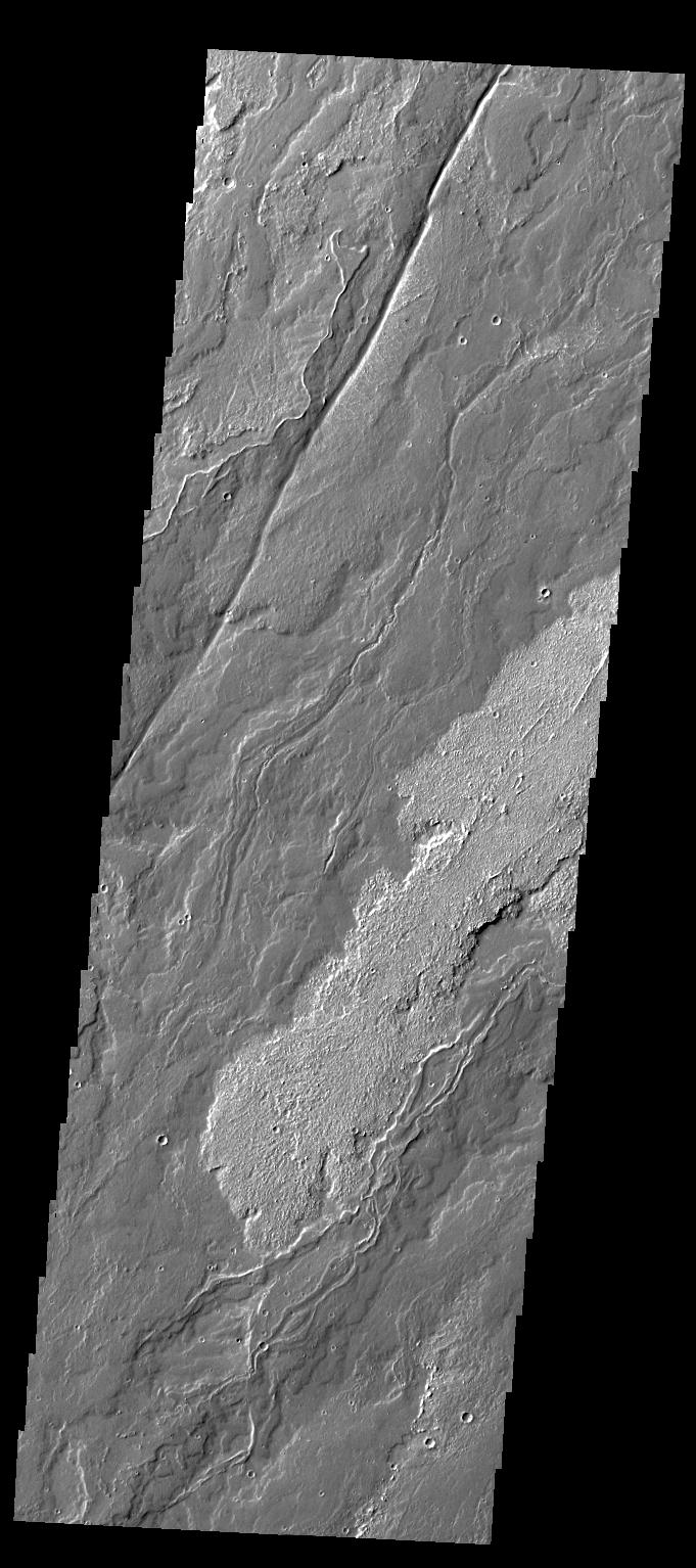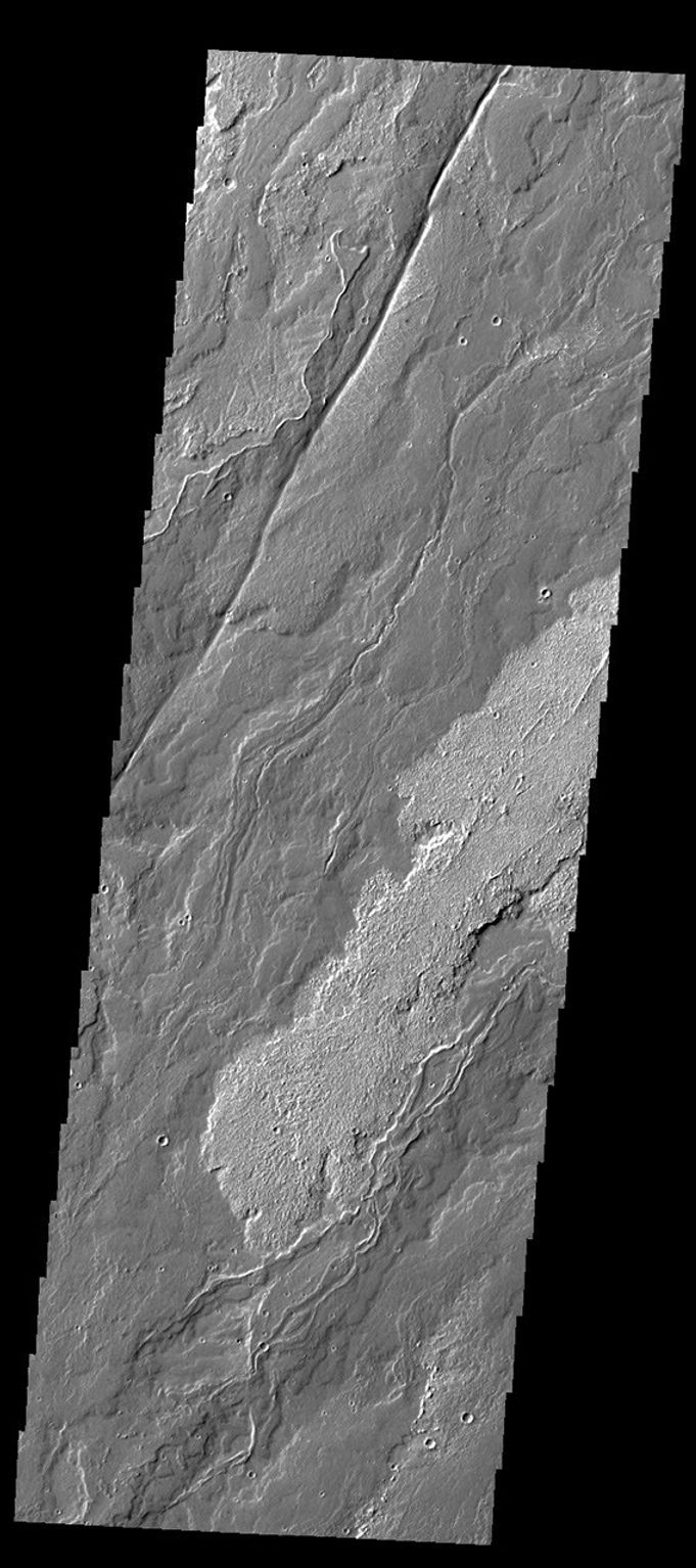 Today's VIS image of Daedalia Planum shows the termination or end of a single flow. In this case it is the end of the brighter/rougher flow on the right side of the image.