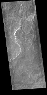 Today's VIS image shows a small part of Daedalia Planum. The lava flows originate from Arsia Mons, one of the large volcanoes in the Tharsis region. The different surface textures are created by differences in the lava viscosity and cooling rates. The lobate margins of each flow can be traced back to the start of each flow — or to the point where they are covered by younger flows. Flows in Daedalia Planum can be as long as 180 km.