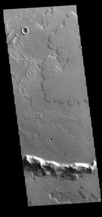 At the bottom of this VIS image of Daedalia Planum is the uppermost rim of an impact crater. The unnamed crater has been almost completely filled by lava flows originating from Arsia Mons.