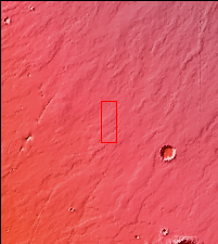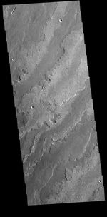 Today's VIS image shows a small portion of the immense lava flows that originated from Arsia Mons. Arsia Mons is the southernmost of the three large aligned volcanoes in the Tharsis region. The different surface textures are created by differences in the lava viscosity and cooling rates. The lobate margins of each flow can be traced back to the start of each flow — or to the point where they are covered by younger flows. Flows in Daedalia Planum can be as long as 180 km.