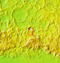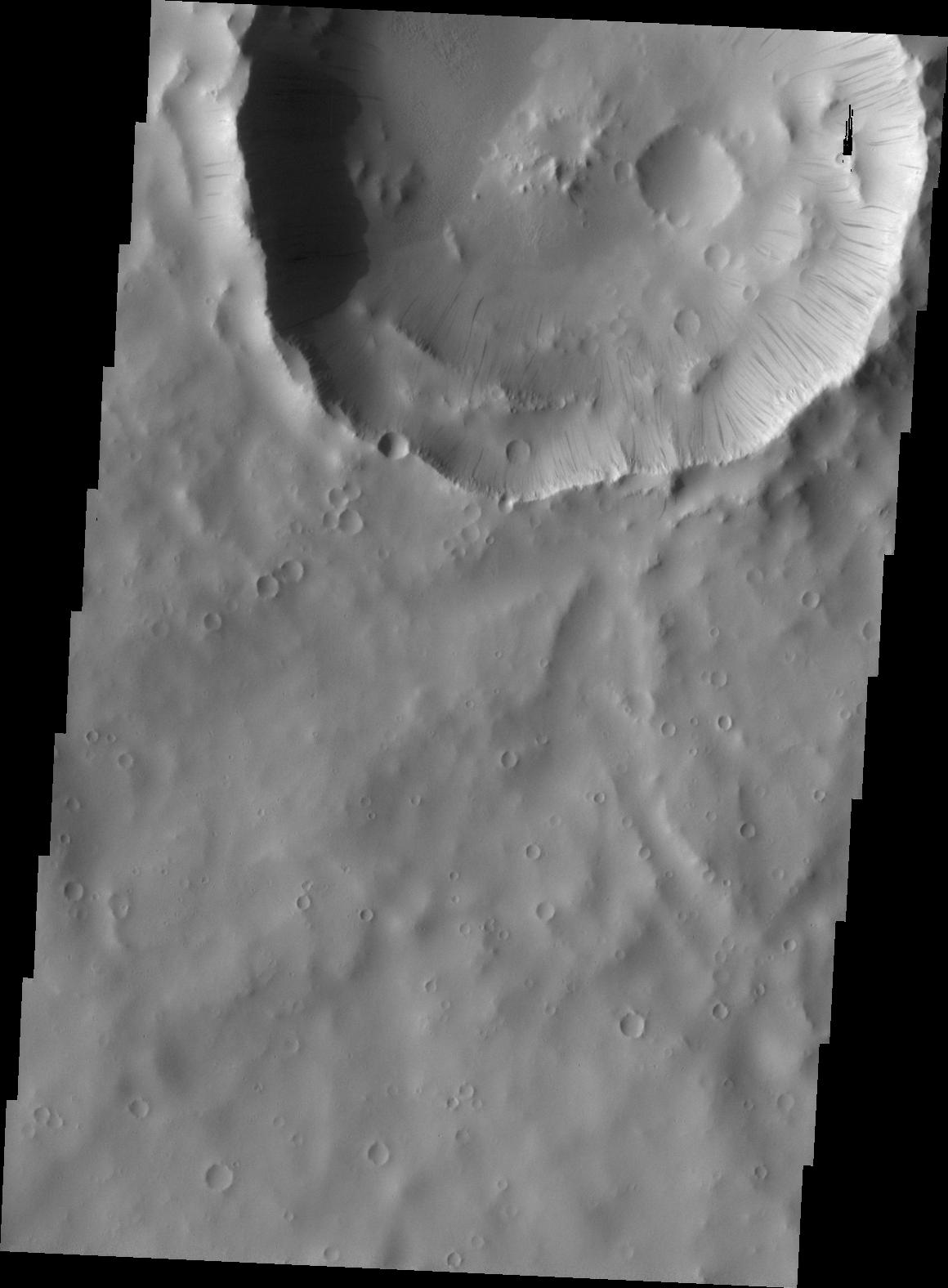 Dark slope streaks mark the rim of this unnamed crater near Schiaparelli Crater.