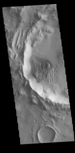 Numerous dark streaks are visible on the inner rim of this unnamed crater. These features may be formed by movement of material downslope, removing dust and revealing an underlying dark surface.