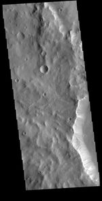 This VIS image is located in Terra Sabaea. The ridge near the right side of the image contains dark slope streaks. These features are thought to form by downslope movement of material which either reveals the darker rock beneath the dust coating, or creates the darker surface by flow of a volatile just beneath the dust coating.
