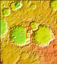 This VIS image shows part of two unnamed craters in Terra Sabaea. Numerous dark streaks mark the slopes of the inner rims. There are several suggested mechanisms to form these features. Two of the mechanisms are that the dusty surface has been altered to reveal darker rock beneath from motion of downward moving dust, or the surface is darkening by fluid or other surface staining.