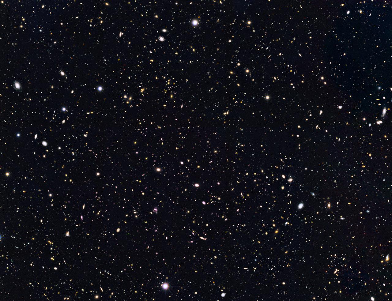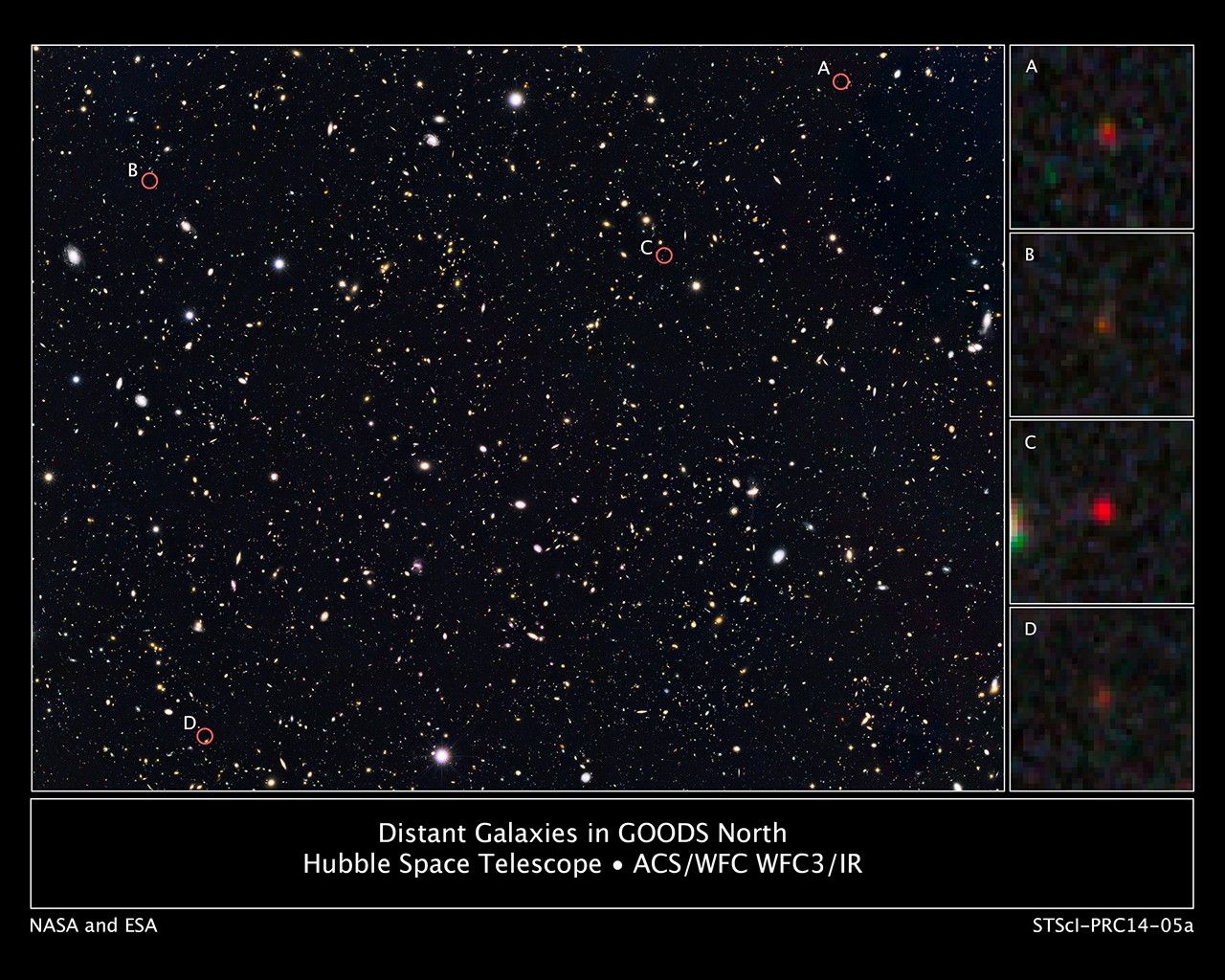 This is a portion of a deep-sky Hubble Space Telescope survey called GOODS North (Great Observatories Origins Deep Survey). The view is a composite of images taken in visible and near-infrared light by NASA's Hubble Space Telescope. Researchers have circled four unusually red objects (see poster version) that appear as they existed just 500 million years after the big bang. They appear red because their light has been stretched to longer infrared wavelengths by the expansion of the universe. These extremely compact and bright galaxies present a puzzle to researchers because they are much more luminous than anything previously seen at such an early epoch. The young galaxies are bright because they are forming stars at a much faster rate than for other galaxies found at such early times.