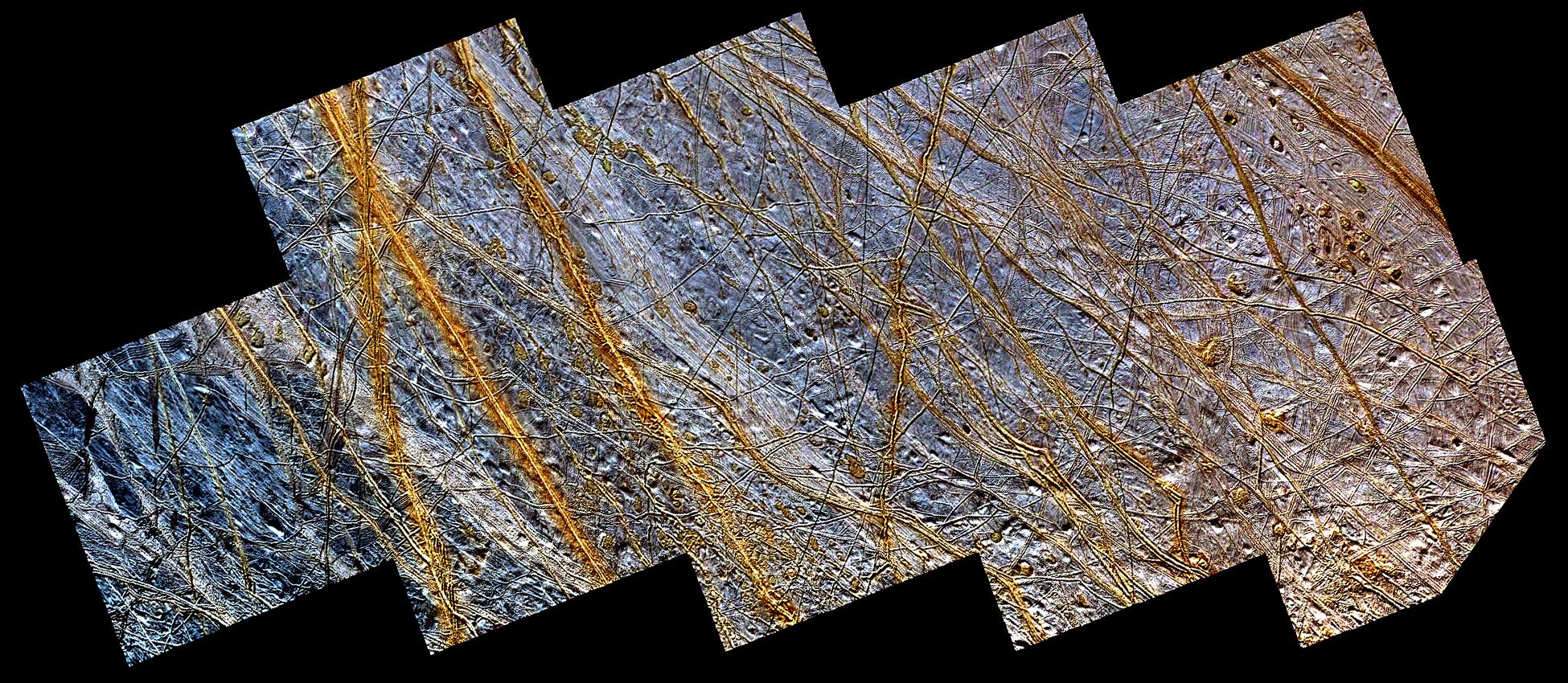 This mosaic of a region in the northern hemisphere of Jupiter's moon, Europa, displays many of the features which are typical on the satellite's icy surface. Brown, linear (double) ridges extend prominently across the scene. They could be frozen remnants of cryovolcanic activity which occurred when water or partly molten water ice erupted on the Europan surface, freezing almost instantly in the extremely low temperatures so far from our sun. Dark spots, several kilometers in diameter, are distributed over the surface. A geologically older, smoother surface, bluish in tone, underlies the ridge system. The blue surface is composed of almost pure water ice, whereas the composition of the dark, brownish spots and ridges is not certain. One possibility is that they contain evaporites such as mineral salts in a matrix of high water content.