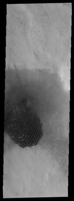 Note: this THEMIS visual image has not been radiometrically nor geometrically calibrated for this preliminary release. An empirical correction has been performed to remove instrumental effects. A linear shift has been applied in the cross-track and down-track direction to approximate spacecraft and planetary motion. Fully calibrated and geometrically projected images will be released through the Planetary Data System in accordance with Project policies at a later time.