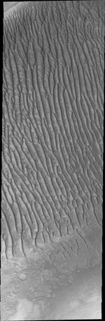 Note: this THEMIS visual image has not been radiometrically nor geometrically calibrated for this preliminary release. An empirical correction has been performed to remove instrumental effects. A linear shift has been applied in the cross-track and down-track direction to approximate spacecraft and planetary motion. Fully calibrated and geometrically projected images will be released through the Planetary Data System in accordance with Project policies at a later time.