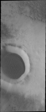 The unnamed crater is filled with a large amount of sand, the surface of which has been sculpted into dune forms. This type of crater fill is common at high latitude.