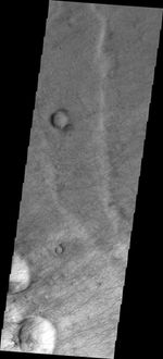 Note: this THEMIS visual image has not been radiometrically nor geometrically calibrated for this preliminary release. An empirical correction has been performed to remove instrumental effects. A linear shift has been applied in the cross-track and down-track direction to approximate spacecraft and planetary motion. Fully calibrated and geometrically projected images will be released through the Planetary Data System in accordance with Project policies at a later time.