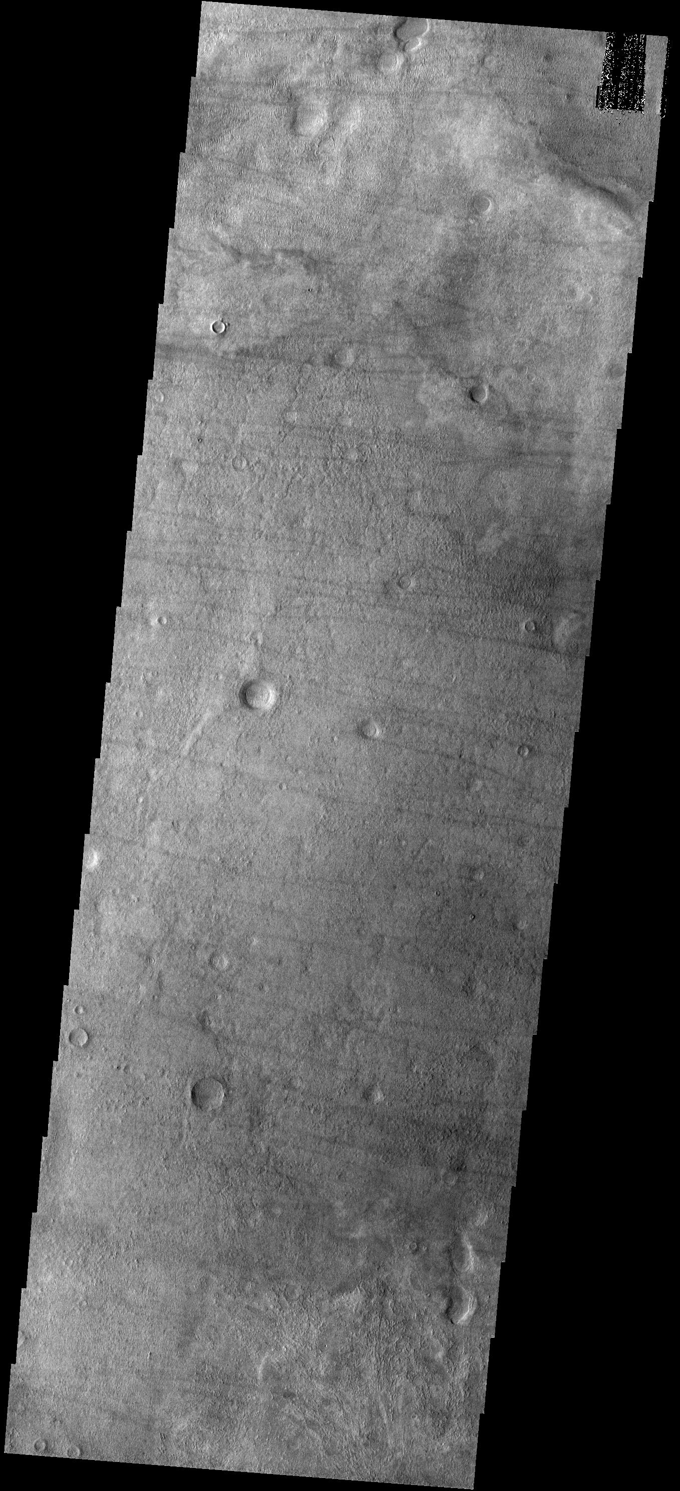 Note: this THEMIS visual image has not been radiometrically nor geometrically calibrated for this preliminary release. An empirical correction has been performed to remove instrumental effects. A linear shift has been applied in the cross-track and down-track direction to approximate spacecraft and planetary motion. Fully calibrated and geometrically projected images will be released through the Planetary Data System in accordance with Project policies at a later time.