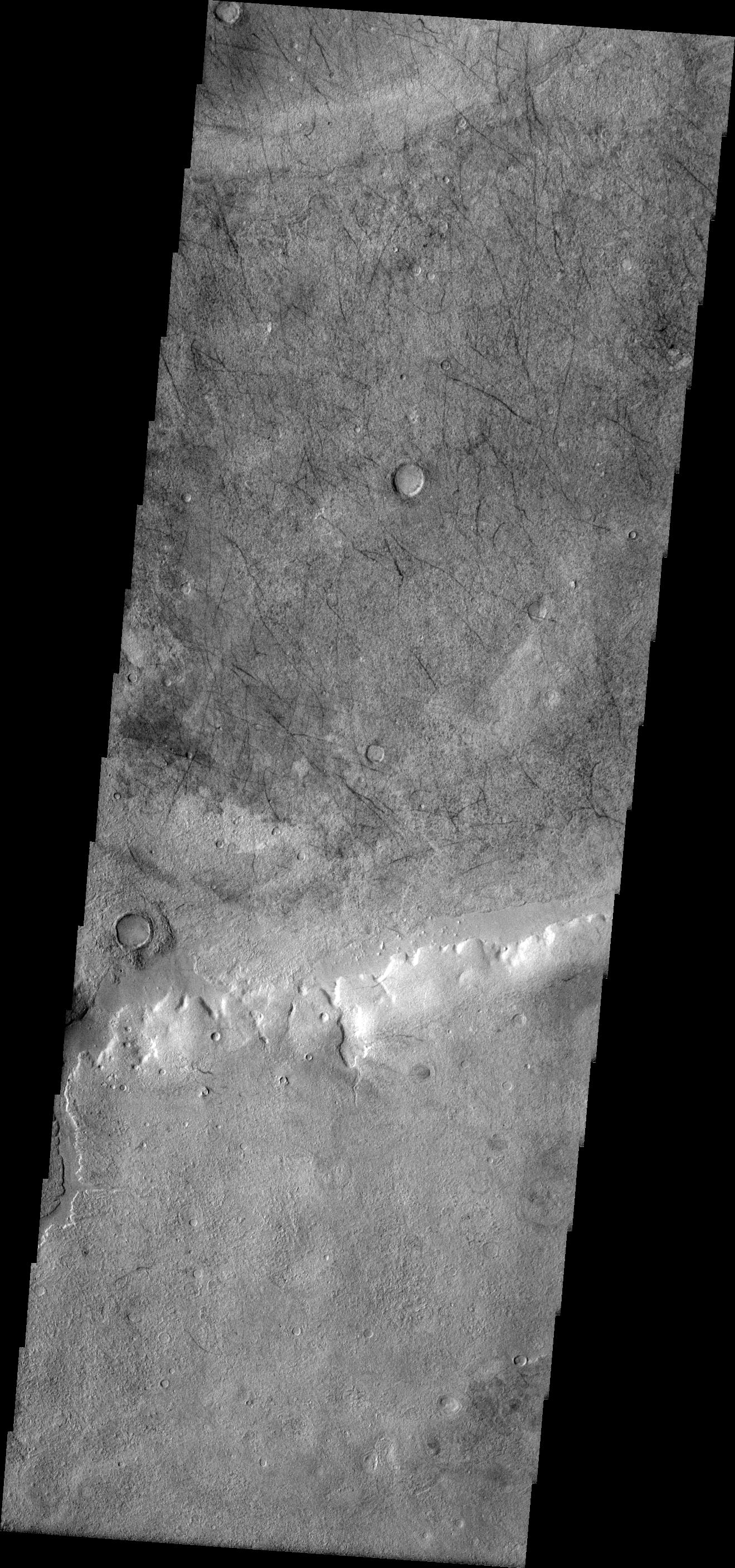 Note: this THEMIS visual image has not been radiometrically nor geometrically calibrated for this preliminary release. An empirical correction has been performed to remove instrumental effects. A linear shift has been applied in the cross-track and down-track direction to approximate spacecraft and planetary motion. Fully calibrated and geometrically projected images will be released through the Planetary Data System in accordance with Project policies at a later time.