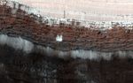 This picture managed to capture a small avalanche in progress, right in the color strip. See if you can spot it in the browse image, and then click on the cutout to see it at full resolution. The small white cloud in front of the brick red cliff is likely carbon dioxide frost dislodged from the layers above, caught in the act of cascading down the cliff. It is larger than it looks, more than 20 meters across, and (based on previous examples) it will likely kick up clouds of dust when it hits the ground.