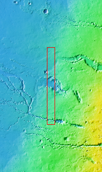 Today's VIS image contains a section of one of the many channel forms found radial to the Elysium Mons volcanic complex. In this case the fossae are located to the west of Elysium Mons. Elysium Fossae are comprised of both linear and sinuous channels, usually interpreted to have both fluid and tectonic forces playing a part in the formation. The linear depression resembles a graben (formed by tectonic forces) and sinuous channels more closely resembles features caused by fluid flow – either lava or water created by melting subsurface ice due to volcanic heating. The Elysium Fossae system is 1044 km (649 miles) in length.