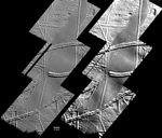 Astypalaea Linea is the smooth, gray area that stretches from north to south across the image mosaic. It is thought to have formed by a combination of pulling apart and sliding of the icy surface. The telltale fold features are within the smoother portions of the surface between the more dominant ridges, which are attributed to upwelling of material through surface ice. In the smooth areas, the surface has gentle swells and dips, which show most clearly in the version on the right, processed to accentuate broader-scale shapes. For example, a dip about 15 kilometers (about 10 miles) wide cuts diagonally across the northern half of the largest smooth area, and a rise runs parallel to that in the southern half of the smooth area.