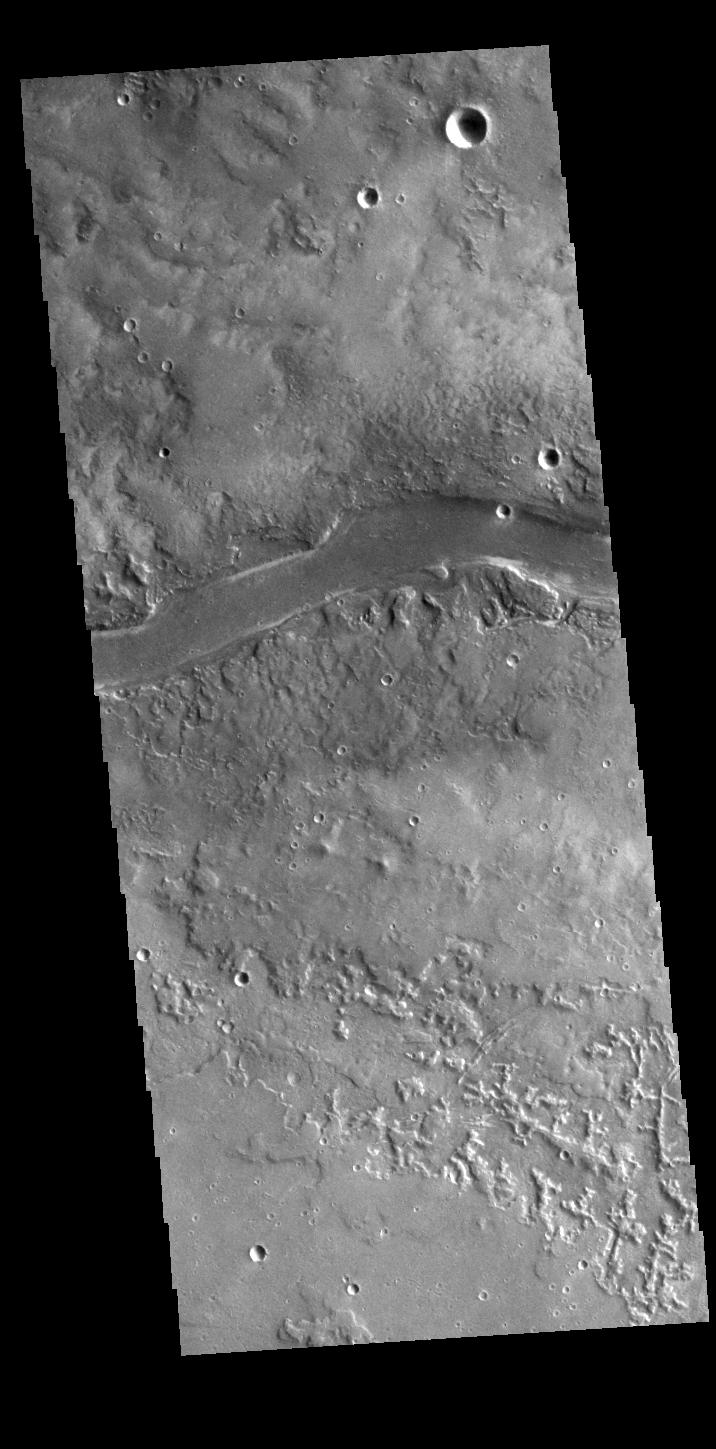 This VIS image shows a section of Granicus Valles, one of several channel systems that originate near the western margin of the Elysium Mons volcanic complex.
