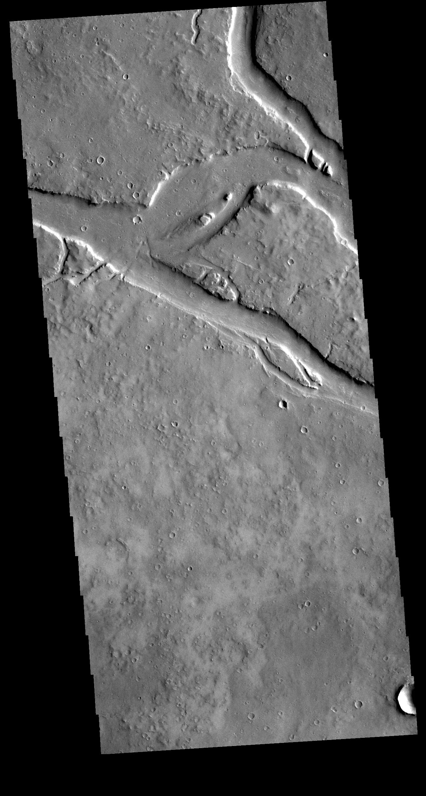 This VIS image shows a section of Granicus Valles, one of several channel systems that originate near the western margin of the Elysium Mons volcanic complex. The channel system is approximately 750 km (466 miles) long. It is likely that both water and lava played a part in creating the channel.